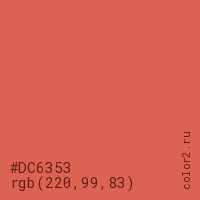 Цвет #DC6353 в цветовой модели RGB обозначается тремя октетами (220, 99, 83) в десятичном формате и #DC6353 в шестнадцатиричном (hex) формате, которые являются интенсивностью красного 220 (hex DC), интенсивность зелёного 99 (hex 63) и интенсивность синего 83 (hex 53).