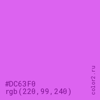 Цвет #DC63F0 в цветовой модели RGB обозначается тремя октетами (220, 99, 240) в десятичном формате и #DC63F0 в шестнадцатиричном (hex) формате, которые являются интенсивностью красного 220 (hex DC), интенсивность зелёного 99 (hex 63) и интенсивность синего 240 (hex F0).