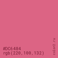 Цвет #DC6484 в цветовой модели RGB обозначается тремя октетами (220, 100, 132) в десятичном формате и #DC6484 в шестнадцатиричном (hex) формате, которые являются интенсивностью красного 220 (hex DC), интенсивность зелёного 100 (hex 64) и интенсивность синего 132 (hex 84).