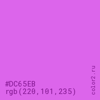 Цвет #DC65EB в цветовой модели RGB обозначается тремя октетами (220, 101, 235) в десятичном формате и #DC65EB в шестнадцатиричном (hex) формате, которые являются интенсивностью красного 220 (hex DC), интенсивность зелёного 101 (hex 65) и интенсивность синего 235 (hex EB).