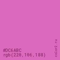 Цвет #DC6ABC в цветовой модели RGB обозначается тремя октетами (220, 106, 188) в десятичном формате и #DC6ABC в шестнадцатиричном (hex) формате, которые являются интенсивностью красного 220 (hex DC), интенсивность зелёного 106 (hex 6A) и интенсивность синего 188 (hex BC).