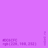 Цвет #DC6CFC в цветовой модели RGB обозначается тремя октетами (220, 108, 252) в десятичном формате и #DC6CFC в шестнадцатиричном (hex) формате, которые являются интенсивностью красного 220 (hex DC), интенсивность зелёного 108 (hex 6C) и интенсивность синего 252 (hex FC).