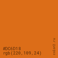 Цвет #DC6D18 в цветовой модели RGB обозначается тремя октетами (220, 109, 24) в десятичном формате и #DC6D18 в шестнадцатиричном (hex) формате, которые являются интенсивностью красного 220 (hex DC), интенсивность зелёного 109 (hex 6D) и интенсивность синего 24 (hex 18).
