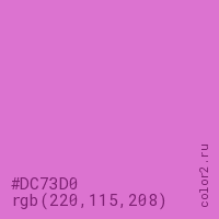 Цвет #DC73D0 в цветовой модели RGB обозначается тремя октетами (220, 115, 208) в десятичном формате и #DC73D0 в шестнадцатиричном (hex) формате, которые являются интенсивностью красного 220 (hex DC), интенсивность зелёного 115 (hex 73) и интенсивность синего 208 (hex D0).