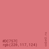 Цвет #DC757C в цветовой модели RGB обозначается тремя октетами (220, 117, 124) в десятичном формате и #DC757C в шестнадцатиричном (hex) формате, которые являются интенсивностью красного 220 (hex DC), интенсивность зелёного 117 (hex 75) и интенсивность синего 124 (hex 7C).