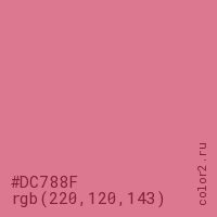 Цвет #DC788F в цветовой модели RGB обозначается тремя октетами (220, 120, 143) в десятичном формате и #DC788F в шестнадцатиричном (hex) формате, которые являются интенсивностью красного 220 (hex DC), интенсивность зелёного 120 (hex 78) и интенсивность синего 143 (hex 8F).