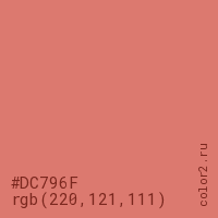 Цвет #DC796F в цветовой модели RGB обозначается тремя октетами (220, 121, 111) в десятичном формате и #DC796F в шестнадцатиричном (hex) формате, которые являются интенсивностью красного 220 (hex DC), интенсивность зелёного 121 (hex 79) и интенсивность синего 111 (hex 6F).