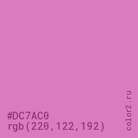 Цвет #DC7AC0 в цветовой модели RGB обозначается тремя октетами (220, 122, 192) в десятичном формате и #DC7AC0 в шестнадцатиричном (hex) формате, которые являются интенсивностью красного 220 (hex DC), интенсивность зелёного 122 (hex 7A) и интенсивность синего 192 (hex C0).