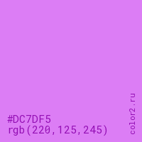 Цвет #DC7DF5 в цветовой модели RGB обозначается тремя октетами (220, 125, 245) в десятичном формате и #DC7DF5 в шестнадцатиричном (hex) формате, которые являются интенсивностью красного 220 (hex DC), интенсивность зелёного 125 (hex 7D) и интенсивность синего 245 (hex F5).
