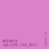 Цвет #DC80C9 в цветовой модели RGB обозначается тремя октетами (220, 128, 201) в десятичном формате и #DC80C9 в шестнадцатиричном (hex) формате, которые являются интенсивностью красного 220 (hex DC), интенсивность зелёного 128 (hex 80) и интенсивность синего 201 (hex C9).