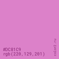 Цвет #DC81C9 в цветовой модели RGB обозначается тремя октетами (220, 129, 201) в десятичном формате и #DC81C9 в шестнадцатиричном (hex) формате, которые являются интенсивностью красного 220 (hex DC), интенсивность зелёного 129 (hex 81) и интенсивность синего 201 (hex C9).