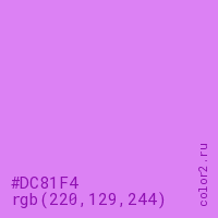 Цвет #DC81F4 в цветовой модели RGB обозначается тремя октетами (220, 129, 244) в десятичном формате и #DC81F4 в шестнадцатиричном (hex) формате, которые являются интенсивностью красного 220 (hex DC), интенсивность зелёного 129 (hex 81) и интенсивность синего 244 (hex F4).