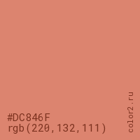 Цвет #DC846F в цветовой модели RGB обозначается тремя октетами (220, 132, 111) в десятичном формате и #DC846F в шестнадцатиричном (hex) формате, которые являются интенсивностью красного 220 (hex DC), интенсивность зелёного 132 (hex 84) и интенсивность синего 111 (hex 6F).