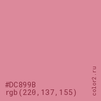 Цвет #DC899B в цветовой модели RGB обозначается тремя октетами (220, 137, 155) в десятичном формате и #DC899B в шестнадцатиричном (hex) формате, которые являются интенсивностью красного 220 (hex DC), интенсивность зелёного 137 (hex 89) и интенсивность синего 155 (hex 9B).