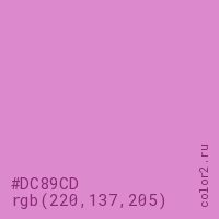 Цвет #DC89CD в цветовой модели RGB обозначается тремя октетами (220, 137, 205) в десятичном формате и #DC89CD в шестнадцатиричном (hex) формате, которые являются интенсивностью красного 220 (hex DC), интенсивность зелёного 137 (hex 89) и интенсивность синего 205 (hex CD).