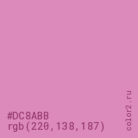 Цвет #DC8ABB в цветовой модели RGB обозначается тремя октетами (220, 138, 187) в десятичном формате и #DC8ABB в шестнадцатиричном (hex) формате, которые являются интенсивностью красного 220 (hex DC), интенсивность зелёного 138 (hex 8A) и интенсивность синего 187 (hex BB).