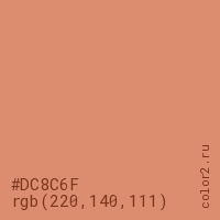 Цвет #DC8C6F в цветовой модели RGB обозначается тремя октетами (220, 140, 111) в десятичном формате и #DC8C6F в шестнадцатиричном (hex) формате, которые являются интенсивностью красного 220 (hex DC), интенсивность зелёного 140 (hex 8C) и интенсивность синего 111 (hex 6F).