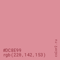 Цвет #DC8E99 в цветовой модели RGB обозначается тремя октетами (220, 142, 153) в десятичном формате и #DC8E99 в шестнадцатиричном (hex) формате, которые являются интенсивностью красного 220 (hex DC), интенсивность зелёного 142 (hex 8E) и интенсивность синего 153 (hex 99).