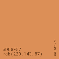 Цвет #DC8F57 в цветовой модели RGB обозначается тремя октетами (220, 143, 87) в десятичном формате и #DC8F57 в шестнадцатиричном (hex) формате, которые являются интенсивностью красного 220 (hex DC), интенсивность зелёного 143 (hex 8F) и интенсивность синего 87 (hex 57).