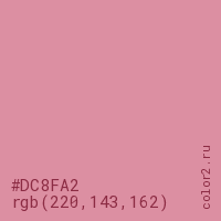 Цвет #DC8FA2 в цветовой модели RGB обозначается тремя октетами (220, 143, 162) в десятичном формате и #DC8FA2 в шестнадцатиричном (hex) формате, которые являются интенсивностью красного 220 (hex DC), интенсивность зелёного 143 (hex 8F) и интенсивность синего 162 (hex A2).