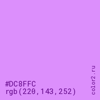 Цвет RGB(220, 143, 252) в процентом отношении количества цвета состоит из 86.3% красного (red), 56.1% зелёного (green) и 98.8% синего (blue).