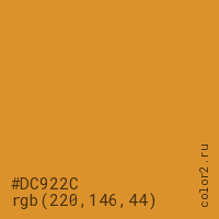 Цвет #DC922C в цветовой модели RGB обозначается тремя октетами (220, 146, 44) в десятичном формате и #DC922C в шестнадцатиричном (hex) формате, которые являются интенсивностью красного 220 (hex DC), интенсивность зелёного 146 (hex 92) и интенсивность синего 44 (hex 2C).