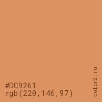 Цвет #DC9261 в цветовой модели RGB обозначается тремя октетами (220, 146, 97) в десятичном формате и #DC9261 в шестнадцатиричном (hex) формате, которые являются интенсивностью красного 220 (hex DC), интенсивность зелёного 146 (hex 92) и интенсивность синего 97 (hex 61).