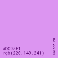 Цвет #DC95F1 в цветовой модели RGB обозначается тремя октетами (220, 149, 241) в десятичном формате и #DC95F1 в шестнадцатиричном (hex) формате, которые являются интенсивностью красного 220 (hex DC), интенсивность зелёного 149 (hex 95) и интенсивность синего 241 (hex F1).