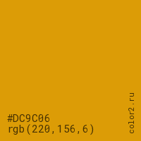 Цвет #DC9C06 в цветовой модели RGB обозначается тремя октетами (220, 156, 6) в десятичном формате и #DC9C06 в шестнадцатиричном (hex) формате, которые являются интенсивностью красного 220 (hex DC), интенсивность зелёного 156 (hex 9C) и интенсивность синего 6 (hex 06).