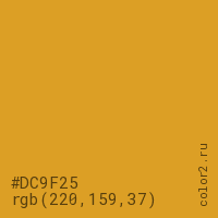 Цвет #DC9F25 в цветовой модели RGB обозначается тремя октетами (220, 159, 37) в десятичном формате и #DC9F25 в шестнадцатиричном (hex) формате, которые являются интенсивностью красного 220 (hex DC), интенсивность зелёного 159 (hex 9F) и интенсивность синего 37 (hex 25).
