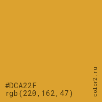 Цвет #DCA22F в цветовой модели RGB обозначается тремя октетами (220, 162, 47) в десятичном формате и #DCA22F в шестнадцатиричном (hex) формате, которые являются интенсивностью красного 220 (hex DC), интенсивность зелёного 162 (hex A2) и интенсивность синего 47 (hex 2F).