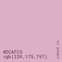 Цвет #DCAFC5 в цветовой модели RGB обозначается тремя октетами (220, 175, 197) в десятичном формате и #DCAFC5 в шестнадцатиричном (hex) формате, которые являются интенсивностью красного 220 (hex DC), интенсивность зелёного 175 (hex AF) и интенсивность синего 197 (hex C5).
