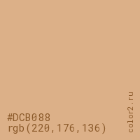 Цвет #DCB088 в цветовой модели RGB обозначается тремя октетами (220, 176, 136) в десятичном формате и #DCB088 в шестнадцатиричном (hex) формате, которые являются интенсивностью красного 220 (hex DC), интенсивность зелёного 176 (hex B0) и интенсивность синего 136 (hex 88).