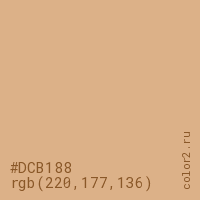Цвет #DCB188 в цветовой модели RGB обозначается тремя октетами (220, 177, 136) в десятичном формате и #DCB188 в шестнадцатиричном (hex) формате, которые являются интенсивностью красного 220 (hex DC), интенсивность зелёного 177 (hex B1) и интенсивность синего 136 (hex 88).