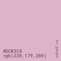 Цвет #DCB3C8 в цветовой модели RGB обозначается тремя октетами (220, 179, 200) в десятичном формате и #DCB3C8 в шестнадцатиричном (hex) формате, которые являются интенсивностью красного 220 (hex DC), интенсивность зелёного 179 (hex B3) и интенсивность синего 200 (hex C8).