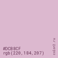 Цвет #DCB8CF в цветовой модели RGB обозначается тремя октетами (220, 184, 207) в десятичном формате и #DCB8CF в шестнадцатиричном (hex) формате, которые являются интенсивностью красного 220 (hex DC), интенсивность зелёного 184 (hex B8) и интенсивность синего 207 (hex CF).