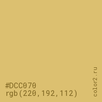 Цвет #DCC070 в цветовой модели RGB обозначается тремя октетами (220, 192, 112) в десятичном формате и #DCC070 в шестнадцатиричном (hex) формате, которые являются интенсивностью красного 220 (hex DC), интенсивность зелёного 192 (hex C0) и интенсивность синего 112 (hex 70).