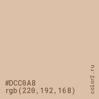 Цвет #DCC0A8 в цветовой модели RGB обозначается тремя октетами (220, 192, 168) в десятичном формате и #DCC0A8 в шестнадцатиричном (hex) формате, которые являются интенсивностью красного 220 (hex DC), интенсивность зелёного 192 (hex C0) и интенсивность синего 168 (hex A8).