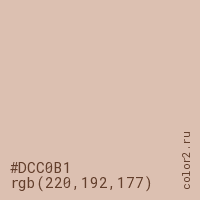 Цвет #DCC0B1 в цветовой модели RGB обозначается тремя октетами (220, 192, 177) в десятичном формате и #DCC0B1 в шестнадцатиричном (hex) формате, которые являются интенсивностью красного 220 (hex DC), интенсивность зелёного 192 (hex C0) и интенсивность синего 177 (hex B1).