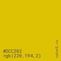 Цвет #DCC202 в цветовой модели RGB обозначается тремя октетами (220, 194, 2) в десятичном формате и #DCC202 в шестнадцатиричном (hex) формате, которые являются интенсивностью красного 220 (hex DC), интенсивность зелёного 194 (hex C2) и интенсивность синего 2 (hex 02).