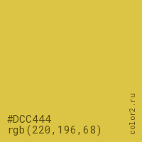 Цвет #DCC444 в цветовой модели RGB обозначается тремя октетами (220, 196, 68) в десятичном формате и #DCC444 в шестнадцатиричном (hex) формате, которые являются интенсивностью красного 220 (hex DC), интенсивность зелёного 196 (hex C4) и интенсивность синего 68 (hex 44).