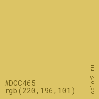Цвет #DCC465 в цветовой модели RGB обозначается тремя октетами (220, 196, 101) в десятичном формате и #DCC465 в шестнадцатиричном (hex) формате, которые являются интенсивностью красного 220 (hex DC), интенсивность зелёного 196 (hex C4) и интенсивность синего 101 (hex 65).