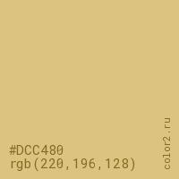 Цвет #DCC480 в цветовой модели RGB обозначается тремя октетами (220, 196, 128) в десятичном формате и #DCC480 в шестнадцатиричном (hex) формате, которые являются интенсивностью красного 220 (hex DC), интенсивность зелёного 196 (hex C4) и интенсивность синего 128 (hex 80).