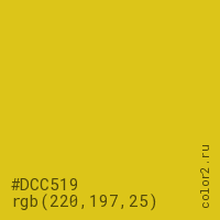 Цвет #DCC519 в цветовой модели RGB обозначается тремя октетами (220, 197, 25) в десятичном формате и #DCC519 в шестнадцатиричном (hex) формате, которые являются интенсивностью красного 220 (hex DC), интенсивность зелёного 197 (hex C5) и интенсивность синего 25 (hex 19).