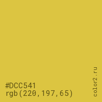 Цвет #DCC541 в цветовой модели RGB обозначается тремя октетами (220, 197, 65) в десятичном формате и #DCC541 в шестнадцатиричном (hex) формате, которые являются интенсивностью красного 220 (hex DC), интенсивность зелёного 197 (hex C5) и интенсивность синего 65 (hex 41).