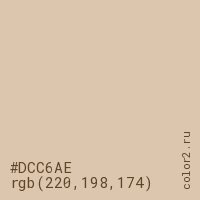 Цвет #DCC6AE в цветовой модели RGB обозначается тремя октетами (220, 198, 174) в десятичном формате и #DCC6AE в шестнадцатиричном (hex) формате, которые являются интенсивностью красного 220 (hex DC), интенсивность зелёного 198 (hex C6) и интенсивность синего 174 (hex AE).
