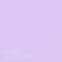 Цвет #DCC6F3 в цветовой модели RGB обозначается тремя октетами (220, 198, 243) в десятичном формате и #DCC6F3 в шестнадцатиричном (hex) формате, которые являются интенсивностью красного 220 (hex DC), интенсивность зелёного 198 (hex C6) и интенсивность синего 243 (hex F3).
