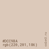 Цвет #DCC9BA в цветовой модели RGB обозначается тремя октетами (220, 201, 186) в десятичном формате и #DCC9BA в шестнадцатиричном (hex) формате, которые являются интенсивностью красного 220 (hex DC), интенсивность зелёного 201 (hex C9) и интенсивность синего 186 (hex BA).