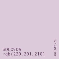 Цвет #DCC9DA в цветовой модели RGB обозначается тремя октетами (220, 201, 218) в десятичном формате и #DCC9DA в шестнадцатиричном (hex) формате, которые являются интенсивностью красного 220 (hex DC), интенсивность зелёного 201 (hex C9) и интенсивность синего 218 (hex DA).