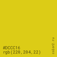 Цвет #DCCC16 в цветовой модели RGB обозначается тремя октетами (220, 204, 22) в десятичном формате и #DCCC16 в шестнадцатиричном (hex) формате, которые являются интенсивностью красного 220 (hex DC), интенсивность зелёного 204 (hex CC) и интенсивность синего 22 (hex 16).